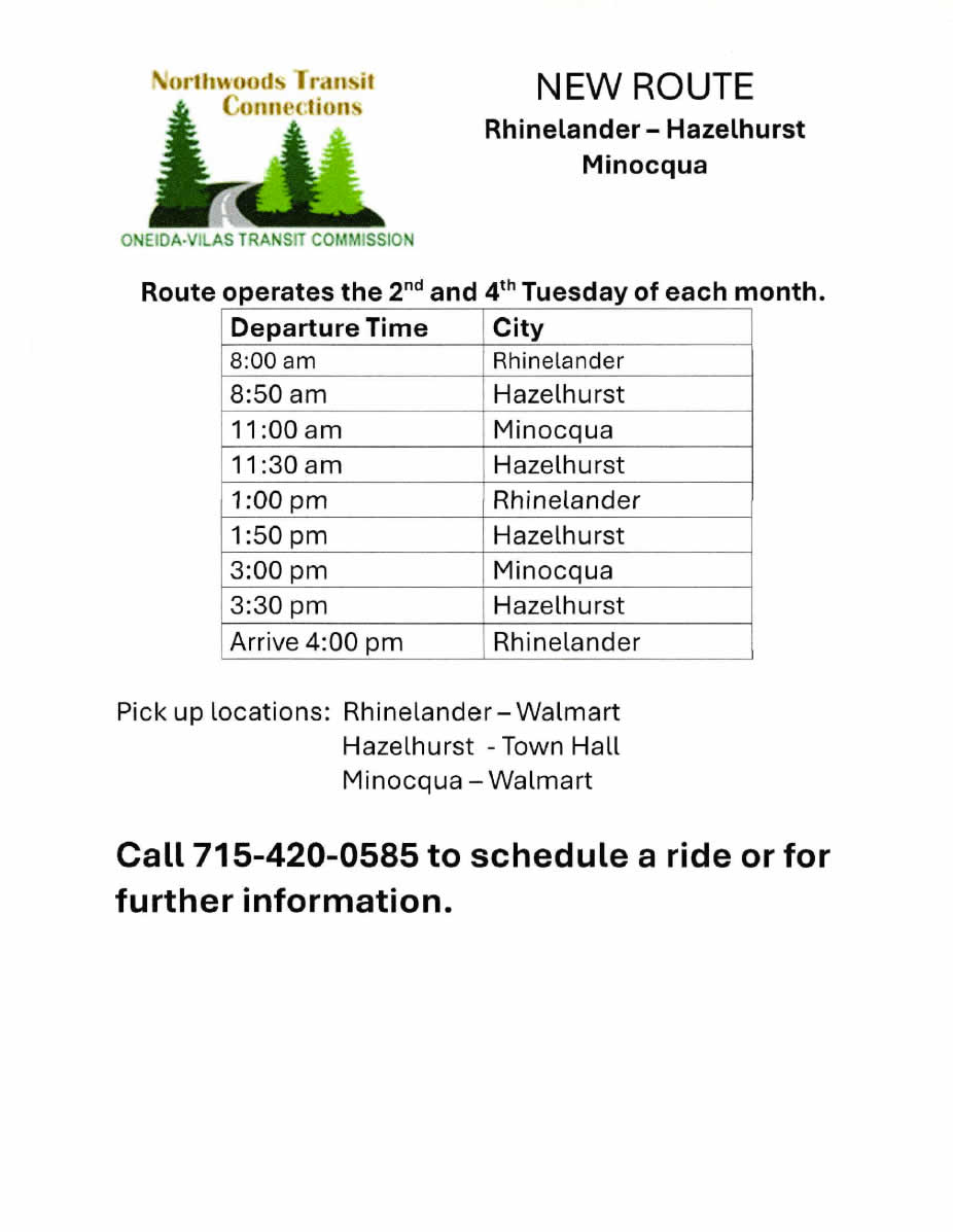 Call 715-420-0585 to schedule a ride or for futher information.